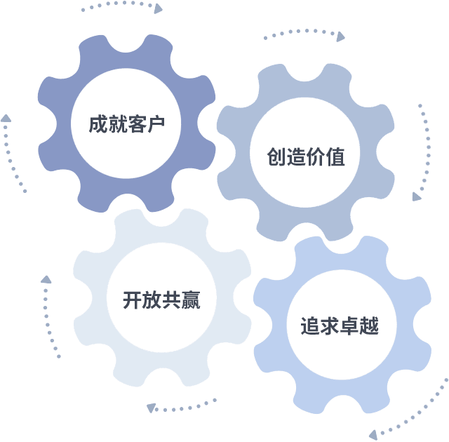 成就客户是一切决策的出发点,,,创造价值是衡量所有工作的标准,,,追求卓越是我们做事做人的态度,,,开放共赢是我们的格局也是最终的结果。。。。价值观的齿轮环环相扣,,,推动着组织里的每个人不断向前。。。。